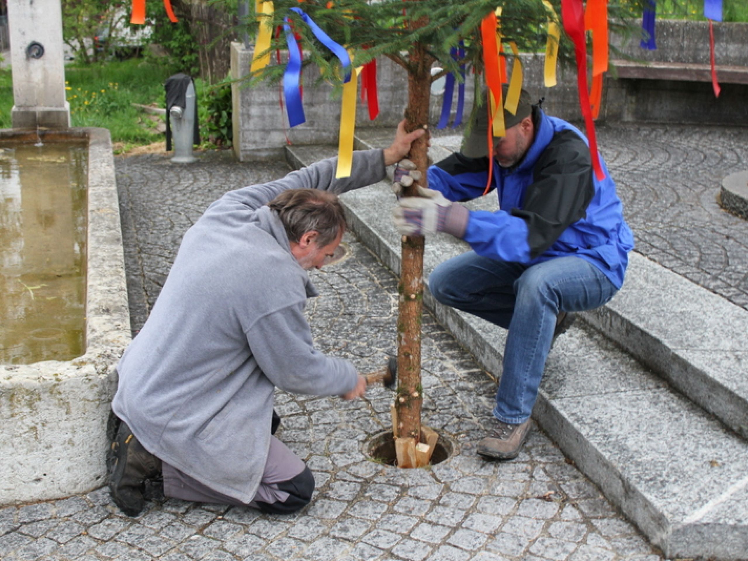 Was bis vor einiger Zeit die Mitglieder der Damenriege organisierten, übernehmen nun die Jungbürgerinnen und Jungbürger von Titterten zusammen mit dem Gemeinderat: Das Maibaumschmücken an den fünf Dorfbrunnen.
