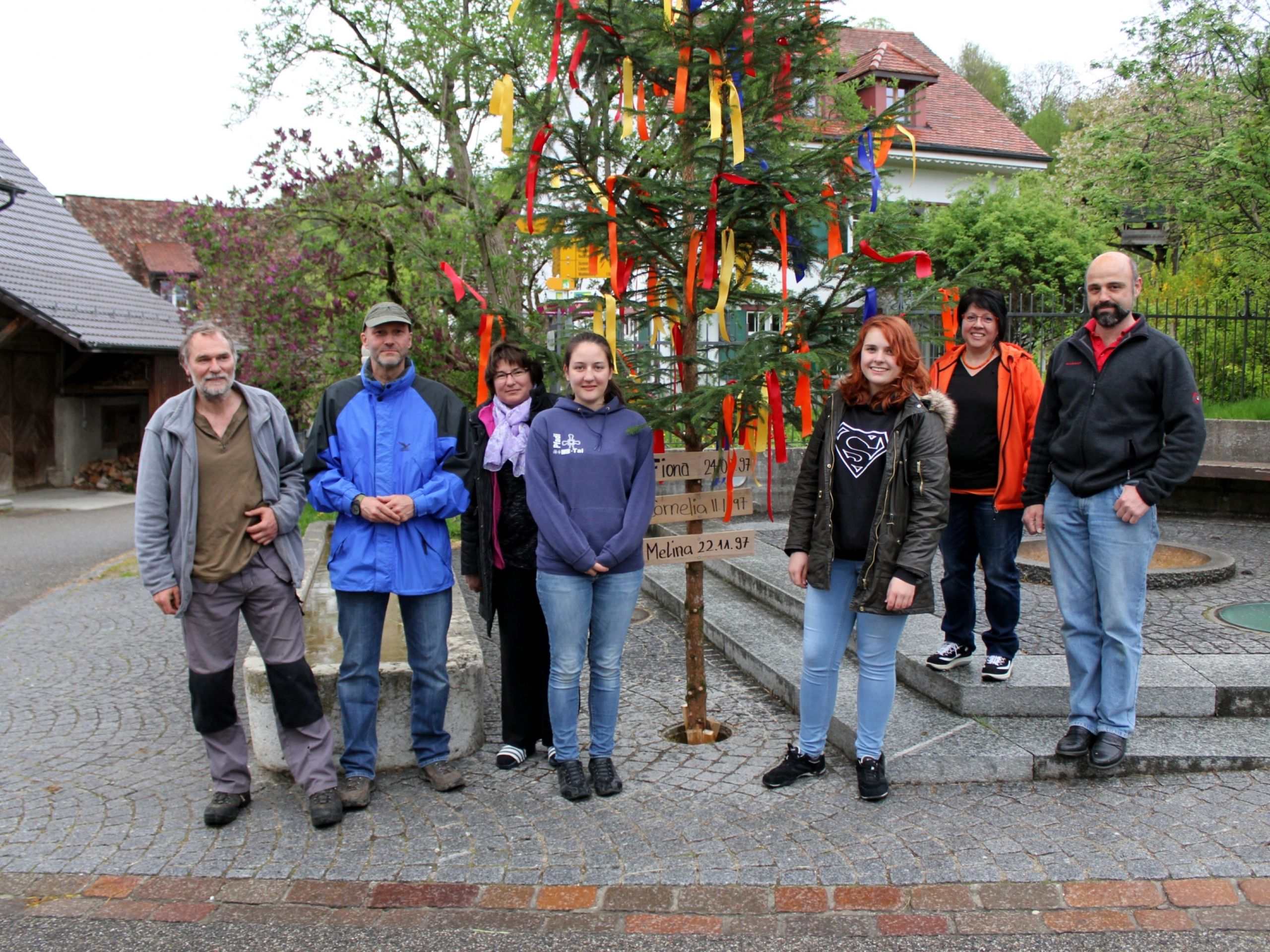 Andere Gemeinden stellen einen einzigen grossen Baum auf den Dorfplatz. Warum wohl sind es bei uns die fünf Tännlein in der Grösse eines mittleren Weihnachtsbaums? Das muss mit dem Wassermangel vergangener Jahrhunderte zusammenhängen. Der Maibaum ist ein Fruchbarkeitssymbol, das die Natur daran erinnern soll, nach dem Winter nun endlich ihre Pracht und ihren Reichtum zu entfalten. Die Natur blüht aber nur, wenn die Brunnen genügend Wasser spenden. Dies sollen sich die fünf Brunnen merken.